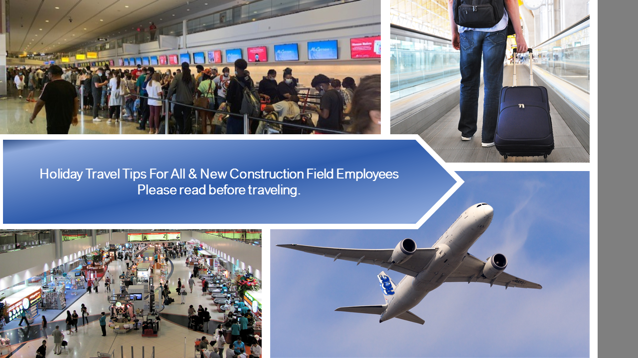 - Allow extra time. Whether you are traveling by car or by air, allow yourself extra time to reach your destination. Many people travel during the holiday season, leading to heavy traffic and long lines at airports. You should arrive at the airport at least 2 hours before your scheduled flight. New Construction Employees: If you reschedule your flight at the check-in counter, you must let your Field Coordinator know the new travel time and flight. Missed or changed flights impact different areas of the business that will also need to be updated including hotel reservations and job site schedules.